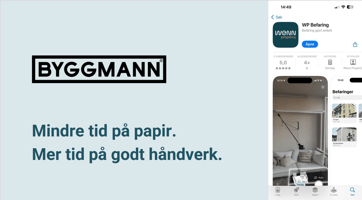 Halver tiden fra befaring til ferdig prosjektplan med appen fra Wenn Property. Medlemmer i BYGGMANN får ekstra gode betingelser.